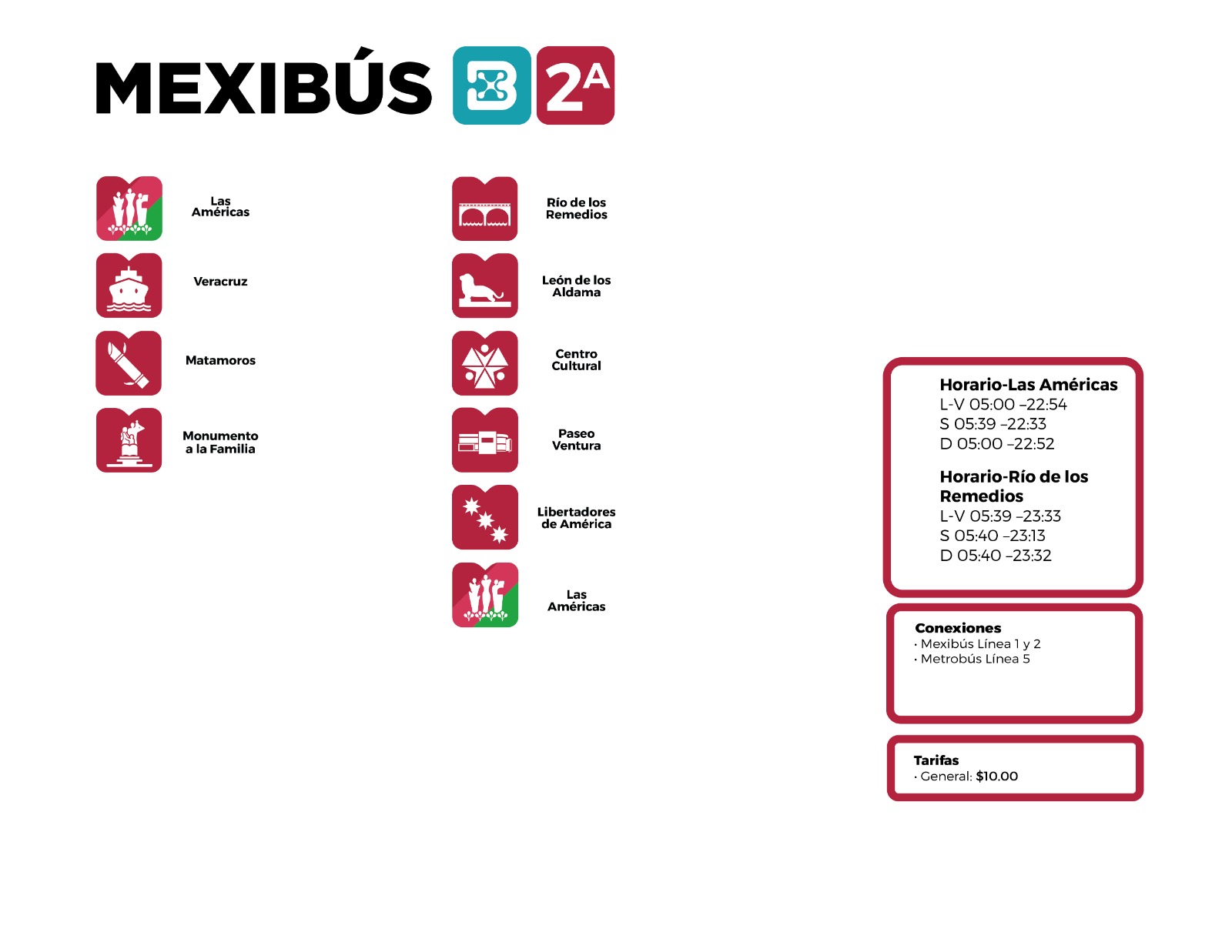 La línea 2 del Mexibús tiene 22.3 kilómetros en su recorrido desde la Terminal Las Américas, en Ecatepec, a La Quebrada, en Cuautitlán Izcalli, circulando por las avenidas: Primero de Mayo, Vía Morelos, Revolución y José López Portillo; y para prestar el servicio cuenta con 42 estaciones y 2 Terminales. Esta línea permite comunicar la Autopista México-Querétaro con la Av. Carlos Hank González (Av. Central) y a su vez los 3 centros comerciales más importantes de los extremos Norte de la metrópoli; Perinorte, Cosmopol y Plaza Las Américas.